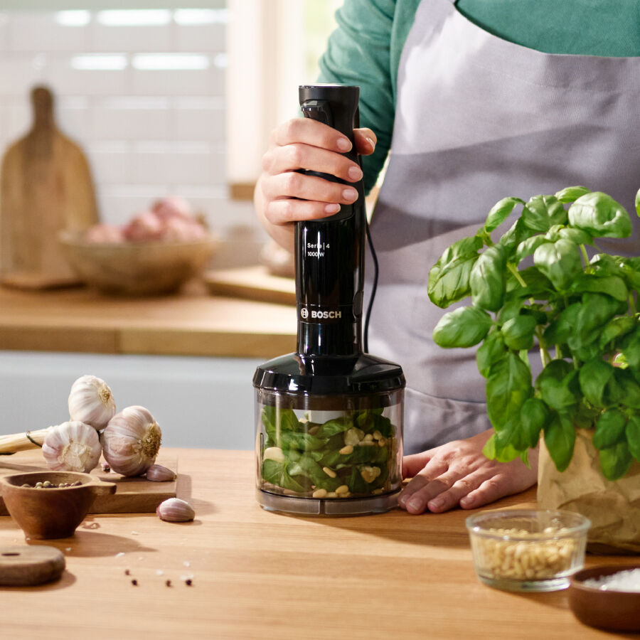 Homemade food simply tastes best. The dishwasher-safe accessories are ready to use right away. With the chopper, ingredients such as herbs, nuts, meat and onions are chopped in no time. With the beating whisk you can beat egg whites, whip up airy creams, stir light cake mixtures or prepare desserts.
