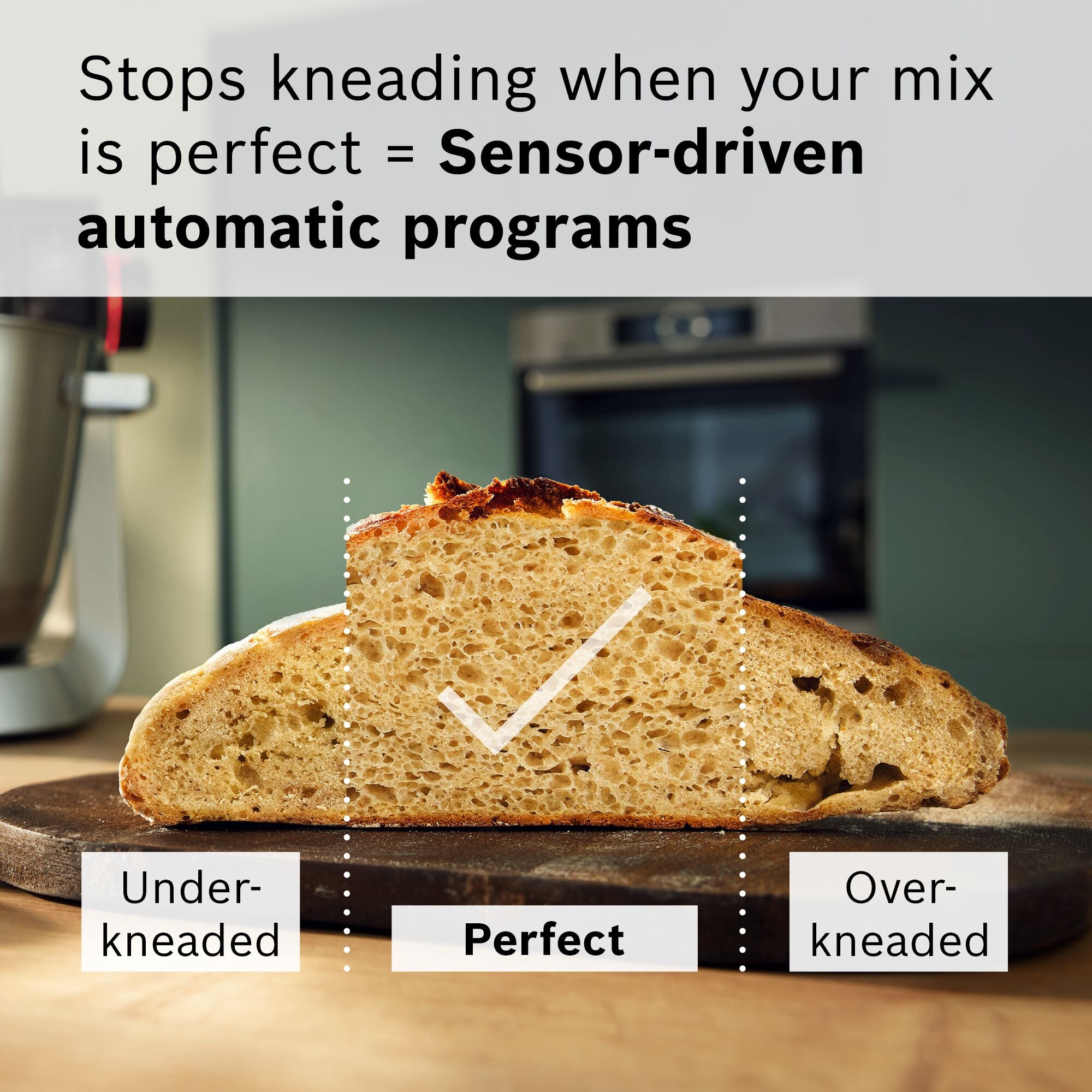 The Series 6 kitchen machine from Bosch offers the perfect combination of an extremely powerful air-cooled 1600W motor and modern sensing technology. The 7 sensor-driven automatic programs monitor the consistency and work precisely for perfect food preparation. Knead, rest, let rise, knead, rest, let rise - the long way to perfect dough, who doesn't know it? The sensing technology allows control over many types of dough and their consistency. They ensure optimal consistency for beaten egg whites, cream, yeast & sourdough, cake batter, shortcrust pastry, pasta dough & strudel dough, and smoothies. Processed just right, not too much, not too little. Weigh as you like - directly in the mixing bowl or on the weighing surface on the mixing arm. The Series 6 kitchen machine displays measurements in 1-gram increments and measures ml of milk and oil. The timer for individual processing times and 7 speed levels, slow folding, and a speed for maximum power are ideal for many tasks and even more precise preparation.